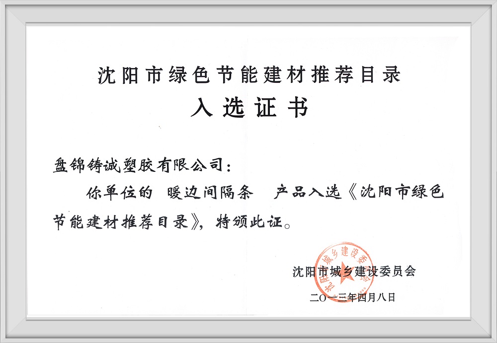 沈陽市綠色節(jié)能建材推薦目錄入選證書
